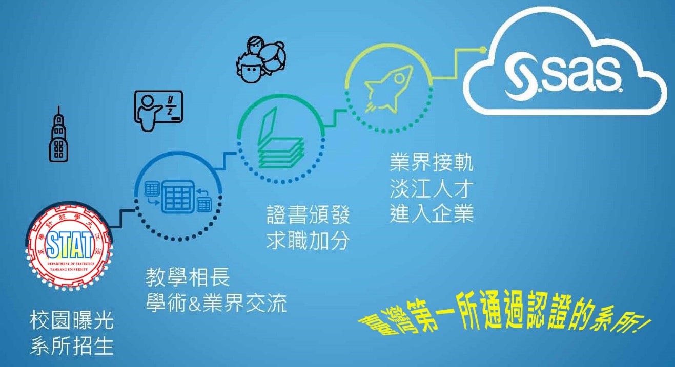 隨著數據科學和人工智能的飛速發展,海量數據在金融、醫療、交通、農業、工業、行銷等各個領域的分析需求大增,運用也越來越普及。有鑑於數據分析師的需求正在蓬勃發展,淡江大學統計學系與SAS公司合作進行應用數據分析之SAS學術資格認證 (SAS Academic Specialization in Applied Data Analytics),奠定學生跨領域應用的數據分析基礎。學術資格認證分成兩個等級,等級1(Tier 1)名稱為【應用數據分析】之SAS學術資格認證 (SAS Academic Specialization in Applied Data Analytics),其目的為學生打好成為SAS數據分析師的基礎。等級2(Tier 2) 名稱為【進階應用數據分析】之SAS學術資格認證 (SAS Academic Specialization in Advanced Applied Data Analytics),其目的為啟發學生感興趣的領域並協助他們的職涯發展。符合申請資格的學生將由淡江大學與SAS公司聯合頒發證書與數位徽章,證明已經具備一定程度的SAS技能,並可分享於個人社群平台或人力銀行資料庫,為將來找工作時贏在起跑點!